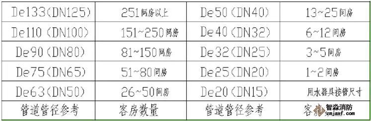 4.冷水管材質采用PPR給水管。【 100間房計算】主水管的管徑在 De90左右以上,干管的管徑:De50-75,支管的管徑:De25-50 。客房衛生間給水管徑要求:不小于PPR-De20的管徑。