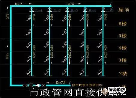 當市政供水管網接入到分店屋頂(或最高樓層,管徑De90以上),出水口的壓力能夠長期穩定在0.15MPa以上時,則可采取此種方式直接供水。
