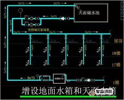 當市政管網的供水壓力夠大(能夠到達最高樓層)但是管徑偏小(小于De50)時,則可在樓頂增設屋頂冷水箱,市政管網接入屋頂冷水箱進行蓄水,在供水的主管道上安裝增壓水泵和變頻控制器,壓力控制以滿足最高樓層的供水壓力不小0.15MPa為準。