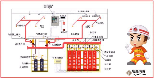 該系統由滅火劑儲存裝置、總控閥、驅動器、噴頭、管道超壓泄放裝置、信號反饋裝置、控制器等組成。
