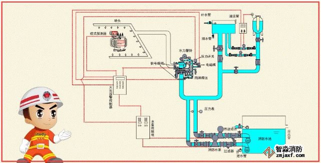 水幕系統由開式灑水噴頭或水幕噴頭、雨淋報警閥組或感溫雨淋閥、供水與配水管道、控制閥以及水流報警裝置(水流指示器或壓力開關)等組成。