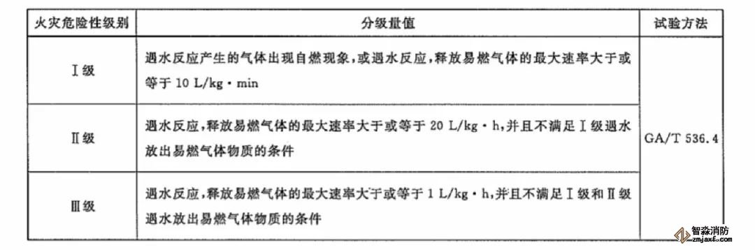 遇水放出易燃氣體物質火災危險性分級方法見下表: