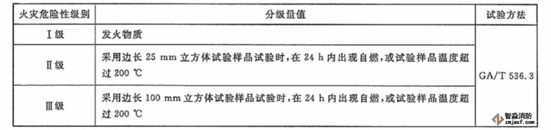 易于自燃的物質火災危險性分級方法見下表: