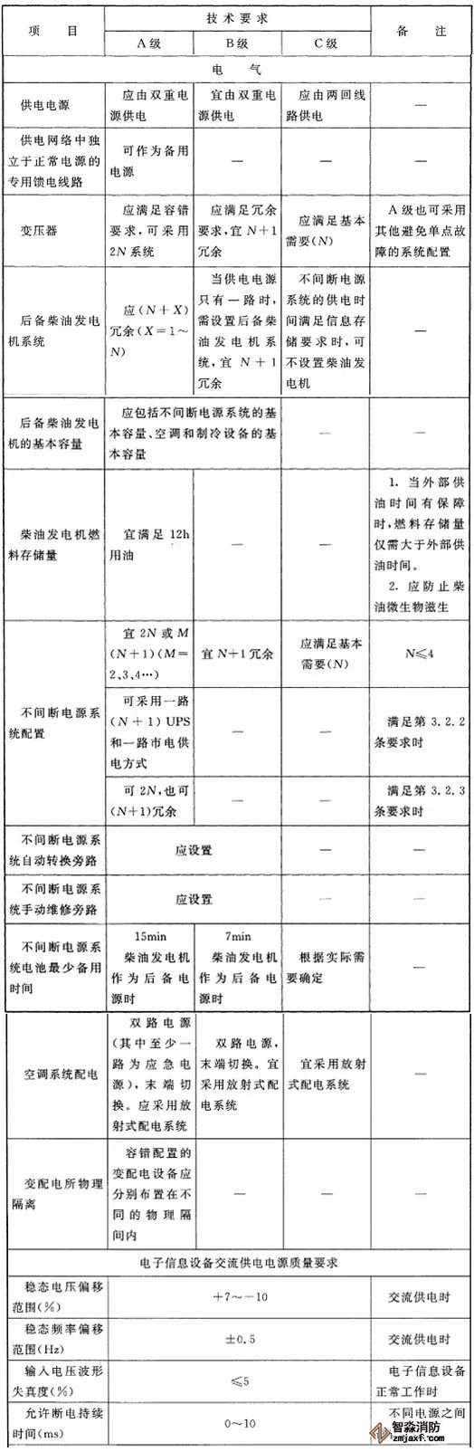 1、數據中心用電負荷等級及供電要求應根據數據中心的等級,按下表技術要求執行,并應符合現行國家標準《供配電系統設計規范》GB 50052的有關規定。