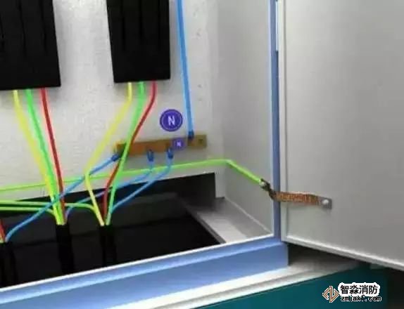 6、黃、綠、紅三相線分別從分配電箱的分路隔離開關引出,從N板接線端子引出淡藍色的工作零線,從PE板接線端子引出黃綠雙色保護零線。