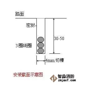 線圈埋設首先要用切路機在路面上切出槽來。在四個角上進行45度倒角,防止尖角破壞線圈電纜。切槽寬度一般為4到8毫米,深度30到50毫米。同時還要為線圈引線切一條通到路邊的槽。但要注意:切槽內必須清潔無水或其它液體滲入。繞線圈時必須將線圈拉直,但不要繃得太緊并緊貼槽底。將線圈繞好后,將雙絞好的輸出引線通過引出線槽引出。