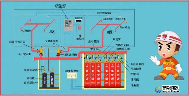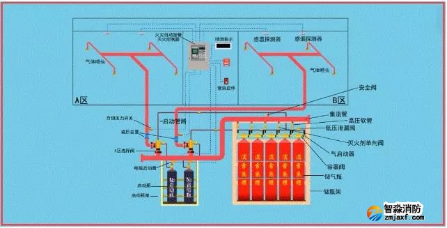 該系統(tǒng)由滅火劑瓶組、加壓氣體瓶組、驅(qū)動(dòng)氣體瓶組(可選)、單向閥、選擇閥、減壓裝置、驅(qū)動(dòng)裝置、集流管、連接管、噴頭、信號(hào)反饋裝置、安全泄放裝置、控制盤(pán)、檢漏裝置、管道管件及吊鉤支架等組成。