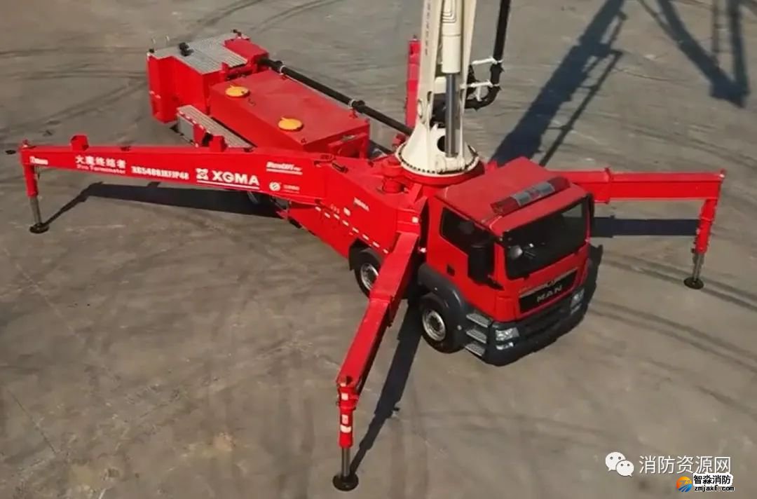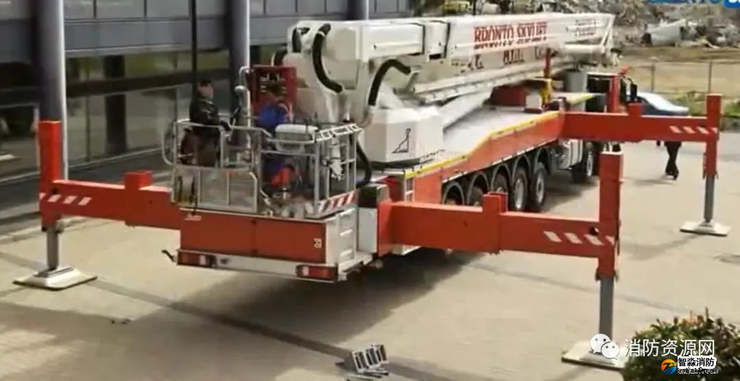 舉高車工作時,通過支腿支撐,支腿通過支承墊板作用在登高場地上,消防車輪胎并不受力(懸空)。