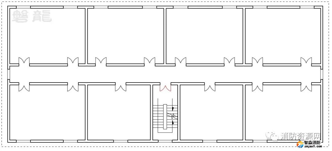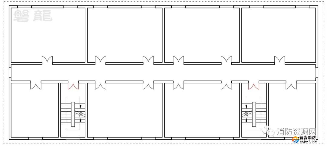 二、圖示2的疏散走道,僅設(shè)置有一個疏散樓梯,疏散走道的所有疏散門均為單向疏散,整個疏散走道均應(yīng)視為單向疏散走道,即袋形走道:
