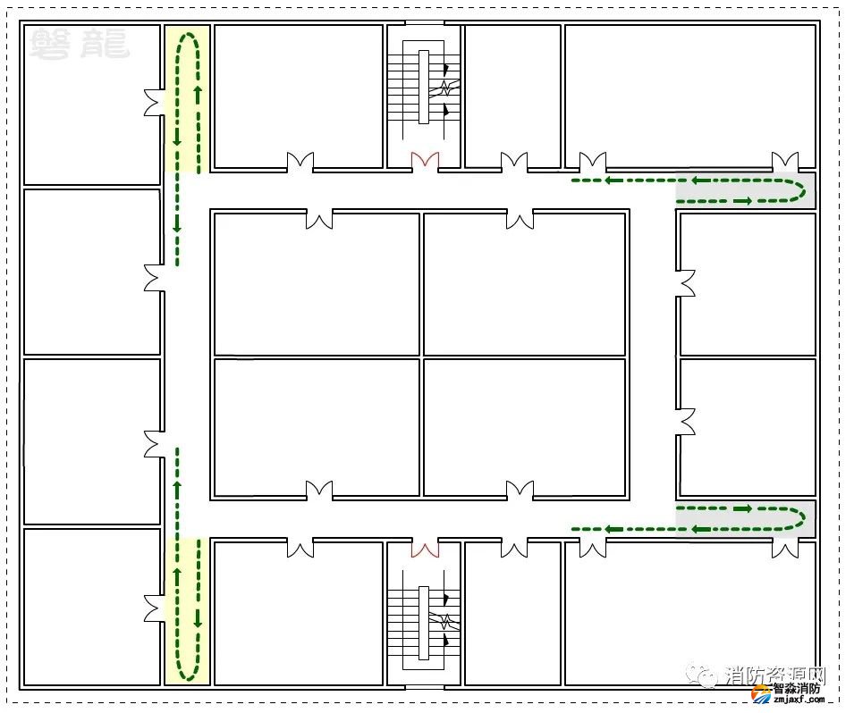 2、圖示12的方案,左側(cè)區(qū)域的T形路徑出來以后,沒有直達(dá)安全出口,不宜采用,右側(cè)區(qū)域的T形路徑應(yīng)嚴(yán)格控制疏散距離。