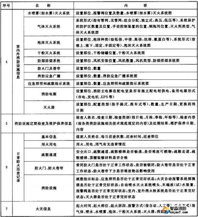 (6)消防設施一覽表,包括消防設施的類型、數量、狀態等內容;