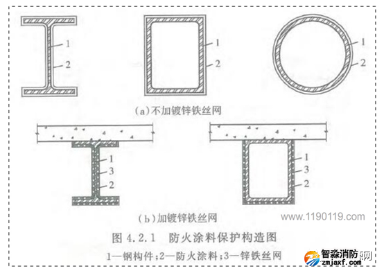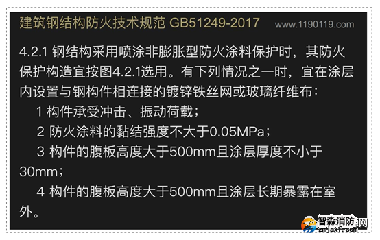 1、根據《建筑鋼結構防火技術規范》4.2.1執規定,部分涂層內應設置與鋼構件相連接的鍍鋅鐵絲網或玻璃纖維布: