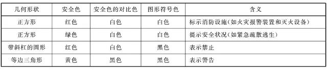 根據(jù)最新國家標(biāo)準(zhǔn)GB13495.1—2015《消防安全標(biāo)志第1部分:標(biāo)志》,消防安全標(biāo)志由幾何形狀、安全色、表示特定消防安全信息的圖形符號(hào)構(gòu)成。標(biāo)志的幾何形狀、安全色及對(duì)比色、圖形符號(hào)色的含義見下表。